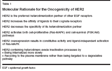 The epidermal growth factor (EGF) receptor family of tyrosine kinases regulates a complex signaling cascade that controls the proliferation, survival, adhesion, migration, and differentiation of cells.[1,2] The dysregulation of EGF receptor signaling by mechanisms such as receptor or ligand overexpression and constitutive activation of receptors can lead to greater cell proliferation and other tumor-promoting activities.[ 3-5] This pathway is therefore tightly regulated in normal cells. The EGF receptor family consists of four distinct receptors: EGFR (ErbB-1), HER2 (HER2/neu, ErbB- 2), HER3 (ErbB-3), and HER4 (ErbB- 4),[2] and their abnormal activation is associated with human cancers of various origins.[6,7] The HER2 gene was cloned in the early 1980s by investigators at Massachusetts Institute of Technology[8,9] and the National Institutes of Health[10] and in Japan.[11] Overexpression of HER2, which has been reported in approximately a third of breast cancers, was found to correlate with tumor resistance to chemotherapy and poor prognosis.[12-15] A meta-analysis that related the expression of HER2 with outcome found that HER2 gene amplification or overexpression of HER2 protein predicted outcome in breast cancer on either univariate or multivariate analysis in 92% of the studies evaluated.[16] Three cellular mechanisms underlie the poor prognosis in patients with HER2-overexpressing tumors.[16-18] First, HER2 overexpression increases the metastatic properties of cancer cells, such as invasion, angiogenesis, and greater survival. Second, HER2 overexpression also confers greater resistance to therapeutic agents (eg, chemotherapy and hormone therapy), which can result in a poor response to treatment. This may correlate with the absence of steroid hormone receptors on HER2-positive cells. Third, HER2 overexpression confers a strong proliferative advantage to tumor cells that are characterized by a high percentage of S-phase cells. In addition, HER2 overexpression has been correlated with larger tumor size and aneuploidy.[ 16,18]