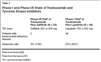 99. Konecny GE, Venkatesan N, Beryt M, et al: Therapeutic advantage of a dual tyrosine kinase inhibitor (GW2016) in combination with chemotherapy drugs or trastuzumab against human breast cancer cells with HER2 overexpression. Proc Am Assoc Cancer Res 43:1003, 2002.