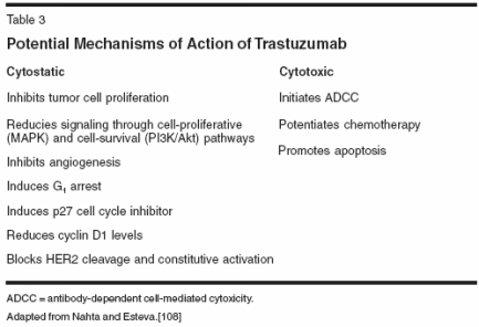 Trastuzumab (Herceptin), a recombinant humanized monoclonal antibody to the extracellular domain of HER2, is the only anti-HER2 agent that has been approved by the US Food and Drug Administration to treat patients with metastatic breast cancer whose tumors overexpress HER2. Trastuzumab has been shown to have both cytostatic and cytotoxic effects in vitro (Table 3). Trastuzumab disrupts receptor signaling through the downstream proapoptotic PI3K/Akt cell-survival pathway (Figure 2).[29-31] Trastuzumab has also been shown to activate the phosphatase activity of the tumor suppressor PTEN, which reverses the activation of PI3K and Akt.[32] Early studies have shown that trastuzumab induces HER2 internalization and degradation in HER2- overexpressing cells[29,33]; however, recent findings suggest that this may not be true.[34] Cells treated with trastuzumab also undergo growth arrest in the G1 phase, accompanied by the induction of the cyclin-dependent kinase inhibitor p27.[33,35,36] Trastuzumab has been shown to suppress angiogenesis in vivo by inducing antiangiogenic factors, such as thrombospondin 1, and suppressing proangiogenic factors, such as vascular endothelial growth factor, transforming growth factor, angiopoietin 1, and plasminogen activator inhibitor 1.[37,38] In addition, trastuzumab can block the process of metalloproteinase-mediated HER2 ectodomain shedding, which has been shown to cause constitutive HER2 signaling.[39]