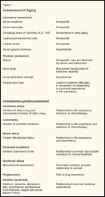 Repetto and colleagues[39] recently published a review describing a clinical approach to the geriatric oncology patient. Table 2 summarizes the variety of current methods used to assess the effects of aging.[39] It is evident that many parameters may be used to assess elderly patients and that the majority of these are nonspecific. Cooperation between geriatricians and oncologists is a potential strategy to improve the pretreatment assessment.