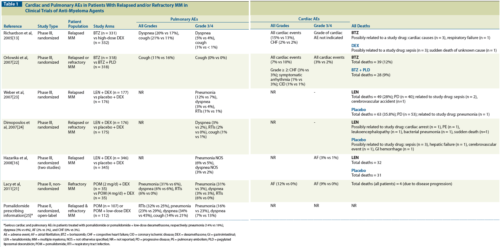Table 1: Cardiac and Pulmonary AEs in Patients With Relapsed and/or Refractory MM in Clinical Trials of Anti-Myeloma Agents