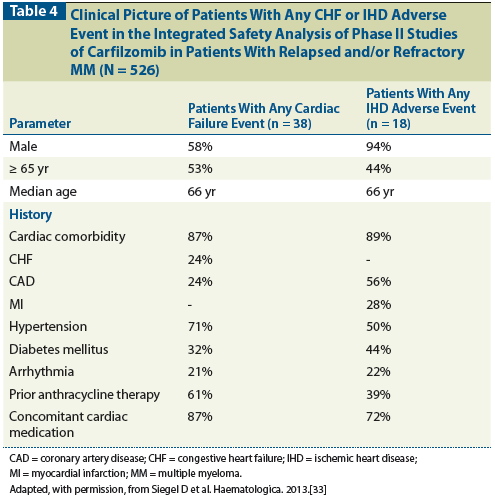 Table 4: Clinical Picture of Patients With Any CHF or IHD Adverse Event in the Integrated Safety Analysis of Phase II Studies of Carfilzomib in Patients With Relapsed and/or Refractory MM (N = 526)