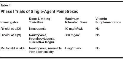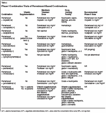 Pemetrexed (Alimta) is an antifolate that is effective in the inhibitionof multiple enzyme targets including thymidylate synthase,dihydrofolate reductase, and glycinamide ribonucleotide formyl transferase.The compound has been evaluated in several phase I trials, bothas single agent and in combination with other cytotoxic agents. Theinitial schedule selected for further investigation in phase II trials waspemetrexed 600 mg/m2 as a 10-minute infusion on day 1 every 21 days.During the subsequent phase II development, the dose of pemetrexedwas adjusted to 500 mg/m2 due to bone marrow and gastrointestinaltoxicities. The adjusted dose of pemetrexed was well tolerated throughoutthe late-phase drug development program. Preclinical evidencesuggests that pemetrexed has additive or synergistic activity when combinedwith many other clinically important anticancer agents, includinggemcitabine (Gemzar), fluorouracil, carboplatin (Paraplatin),oxaliplatin (Eloxatin), paclitaxel, and vinorelbine (Navelbine). Doselimitingtoxicities in these studies were primarily hematologic, and therewas no evidence of cumulative hematologic toxicity. During the drugdevelopment program it was discovered that supplementation with folicacid and vitamin B12 profoundly increased the tolerability ofpemetrexed. The studies discussed in this review demonstrate thatpemetrexed is well tolerated as a single agent and will be an importantcontribution to combination chemotherapy regimens.