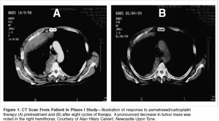 Hughes A, Calvert P, Azzabi A, et al:Phase I clinical and pharmacokinetic study ofpemetrexed and carboplatin in patients withmalignant pleural mesothelioma. J Clin Oncol20:3533-3544, 2002.