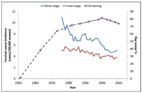Results: From 1951 to 1973, there was a steady increase in screening utilization. Screening rates rose from under 1% in 1951 to 63.7% in 1973. However, over the past 3 decades, the percentage of adult women who received cervical cancer screening remained steady at 71.7% in 1982 and rising to 73.8% in 2010. From 1976 to 2009, there was a statistically significant decrease in the incidence of early-stage cervical cancer, from 10.2 cases to 5.4 cases per 100,000 women (P < .001). Late-stage disease incidence also decreased from 5.2 cases to 3.7 cases per 100,000 women (P < .001). After adjusting for “prescreening era” rates of cervical cancer, we estimated that Pap smears were associated with a reduction of between 102,000 and 452,000 cases of cervical cancer over the past 3 decades in the US.
