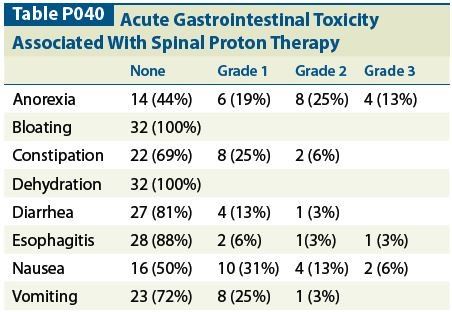 Radiation to the spine may be associated with gastrointestinal (GI) toxicity, including nausea, vomiting, anorexia, and esophagitis. Proton therapy is expected to reduce this due to decreased exposure of the GI system when posterior-anterior beams are utilized.