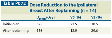 Results: A total of 84 patients underwent lung SBRT at our institution during the study period, of whom 42 were female. Twelve were excluded from this analysis because of a history of previously treated breast cancer (n = 7) or previous thoracic radiation (n = 5). Of the remaining 30 patients, the median age was 79 years (range: 59–94 yr). The predominant histology was adenocarcinoma (n = 24). Tumor stage was as follows: T1a = 12, T1b = 11, and T2a = 7. Twenty tumors were right-sided, eight were left-sided, and three patients presented with bilateral tumors. Median dose was 48 Gy in four fractions (range: 32.5–56 Gy). Median planning target volume (PTV) was 30.2 cc. The median Dmean, V5, and V2 received by the ipsilateral breast initially were 261 cGy, 19.5%, and 26.2%, respectively. PTV and breast volume were not significant predictors of any of the aforementioned dosimetric parameters. Isocenter location anterior to the carina did significantly correlate with the ipsilateral breast Dmean and V5 (P < .05 for both). Results of the 14 patients who were replanned are shown in Table 1. Dmean, V5, and V2 were significantly lowered after replanning (P < .05 for all). Replanning did not significantly increase the total lung V20, ipsilateral lung V20, chest wall V30, heart Dmax, esophagus Dmax, contralateral breast Dmean, or V2. There was a nonsignificant increase in the ipsilateral breast Dmax. The spinal cord Dmax and contralateral breast V5 were significantly increased, though still within tolerance.