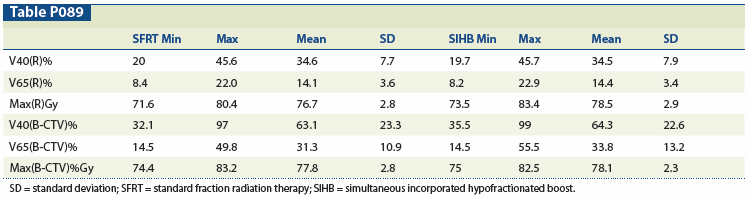 Results: Prostate bed CTV volumes ranged from 84.8 to 202.7 cc, with a mean (standard deviation [SD]) of 143.3 cc (39.2). GTV volumes ranged from 0.31 to 10.4 cc, with a mean (SD) of 2.34 cc (2.8). The table contains normal tissue criteria, which were achieved for all variables aside from bladder. Five plans had > 70% of the bladder receiving ≥ 40 Gy, and one plan had > 50% of the bladder receiving ≥ 65 Gy; these were considered secondary protocol variations and appeared to be due to suboptimal bladder filling. The PTV coverage ranged from 95.0% to 97.9%. The GTV coverage ranged from 95.0% to 100%. In terms of dosimetric constraints, as well as PTV coverage, there was no difference between the SIHB plans and SFRT plans per patient or overall.