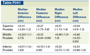 Results: With a median follow-up of 4.1 years, 546 patients met inclusion criteria. Actuarial 5-year BPFS was 97.5%. As summarized in the Table, there was a median overlap of the 160-Gy isodose line for all 12 anatomic locations. There were no significant differences in BPFS when comparing patients with overlap vs underlap at any site or cumulative axial direction (eg, all anterior sites). In addition, there were no significant differences in BPFS when comparing patients with overlaps at any site that were above vs below the median overlap for each respective site. With regard to toxicities, overlap vs underlap affected change in IPSS at the mid-left gland (P = .040, two-sided), proctitis incidence at the inferior-left gland (P = .003, two-sided), and incidence of retention at the inferior-left gland (P = .003, two-sided). Overlap vs underlap was not found to affect toxicities at any of the other sites.