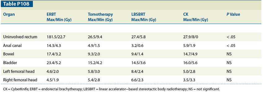 Materials and Methods: The planning CT scans of 10 patients who received ERBT were retrieved. These CT scans were acquired with an endorectal applicator in place, which distends the rectal wall and facilitates rectal immobilization and tumor localization. Using these planning CT scans, tomotherapy, seven-field linac-based SBRT, and CK dose distributions were generated for the same dose schedule that was used for the ERBT (26 Gy in four fractions, prescribed to the outermost tumor margin). All external beam plans were prescribed to an isodose envelope covering 95% of the target and ensuring 99% of the target receives a minimum of 90% of the prescribed dose. For this comparative dosimetric study, the planning target volume (PTV) was considered equal to the gross tumor volume (GTV) for all plans. One-way analysis of variance (ANOVA) testing was used to compare max and mean values observed for selected organs at risk.
