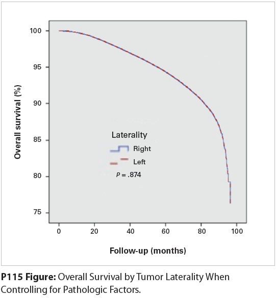 Results: We identified 344,831 patients treated between 1998 and 2006 for noninvasive (12.1%) and invasive carcinoma (87.9%), with a median follow-up of 72.5 months (range: 0–170 mo) in the overall cohort. Clinical, tumor, and treatment characteristics of patients with left-sided cancers (50.7%) closely matched those of patients with right-sided cancers. Regional nodal radiation was employed in 14.2% of patients treated for invasive cancer. No difference in OS was noted when comparing patients by tumor laterality for patients treated with breast-only radiotherapy (hazard ratio [HR] = 0.984; 95% confidence interval [CI], 0.965–1.005; P = .132), as well as for invasive carcinoma treated with breast and regional nodal radiotherapy (HR = 1.001; 95% CI, 0.959–1.045; P = .957). In multivariate analysis including potential confounders of a potential OS-by-laterality effect, OS was identical between left- and right-sided cancers (Figure; HR = 1.002; 95% CI, 0.973–1.032; P = .874). When analyzing patients with at least 10 years of follow-up (n = 27,725), it remained that there was no significant difference in OS by laterality, both in patients treated with breast-only (HR = 0.955; 95% CI, 0.863–1.056; P = .368) and breast plus regional nodal radiotherapy (HR = 0.859; 95% CI, 0.668–1.080; P = .155).