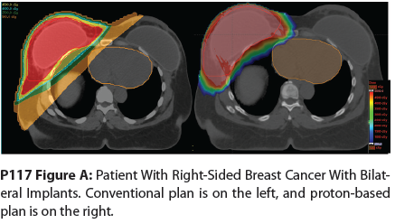 Results: Dose-volume constraints were difficult to meet with conventional radiation in three patients with right-sided breast cancer because of significant breast ptosis (n = 2) or bilateral implants (n = 1). For two of the three patients, IMC irradiation was omitted in order to meet the lung V20 constraint. In these three patients, ipsilateral lung V20 with a conventional plan treating the IMC ranged from 44.7% to 47.5%. The lung V20 was decreased by adding a proton component to the plan, with lung V20 ranging from 14.4% to 26.1%. The mean heart dose ranged from 1.7–4.3 Gy for the conventional plans compared with 0.6–0.8 Gy for the proton-based plans. In the five patients with left-sided disease, constraints were difficult to meet in the two postmastectomy patients with a chest wall too thick or too variable in depth for electrons only, in one patient with large breasts and significant ptosis, in one patient with a heart-shaped thorax, and in one patient with severe arthritis limiting upper-extremity extension. In these five patients, the mean heart dose ranged from 6–19 Gy for the conventional plans compared with 0.8–2.9 Gy for the proton-based plans. In the conventional plans, ipsilateral lung V20 ranged from 40% to 46% compared with 9.8% to 31.6% with the proton-based plans. Cardiac V5 and lung V5 were reduced for both right- and left-sided disease treated with proton-based RT (mean cardiac V5 right: 15% vs 1.3%; mean lung V5 right: 75% vs 40%; mean cardiac V5 left: 29% vs 5%; mean lung V5 left: 58% vs 32% for conventional vs proton radiotherapy, respectively). In addition, for left-sided breast cancers, a decrease in cardiac V20 and V50 was seen with the proton-based plans (mean cardiac V20: 18% vs 2% and mean cardiac V50: 5.5% vs 1.5% for conventional vs proton radiotherapy, respectively).