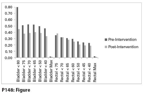 Results: Our bladder V75Gy was reduced from 9.5% to 6% (P = .05), and rectum V70Gy and V50Gy were reduced from 12.8% and 29.0% to 9.4% and 22.5%, respectively (P < .05). Moreover, the coefficients of variation for each dosimetric endpoint, except for rectal V75Gy and V70Gy, were higher preintervention compared with patients treated postimplementation of updated guidelines/MatLab (see Figure).