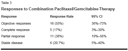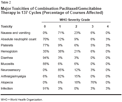 Any patient who had received atleast one course of paclitaxel/gemcitabine was evaluable for safetyand toxicity. The type and severity ofthese toxicities was determined usingWHO criteria.Statistical Considerations