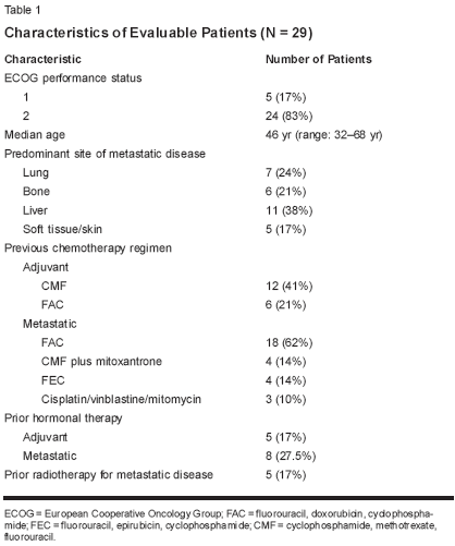 Twenty-nine patients with a medianage of 46 years (range: 32-68 years)were enrolled. All were consideredeligible for evaluation of response andtoxicity. Patient characteristics aresummarized in Table 1. Previous chemotherapyincluded (1) fluorouracil(5-FU), doxorubicin (Adriamycin),and cyclophosphamide (Cytoxan,Neosar), known as FAC (14 cases offirst-line therapy and four cases of second-line therapy after failure of cyclophosphamide,methotrexate, and5-FU [CMF]); (2) 5-FU, epirubicin(Ellence), and cyclophosphamide, or FEC (four cases of first-line therapy);(3) mitoxantrone (Novantrone) plusCMF (four cases of first-line therapy);and (4) cisplatin, vinblastine, and mitomycin(Mutamycin) (three cases ofsecond-line therapy after failure ofFAC). All but four patients had a tumorresponse with prior chemotherapy.Seventeen (59%) patientswere considered truly anthracyclineoranthracenedione-refractory (ie, theyhad progressed during the use of regimenscontaining these agents). Themedian follow-up was 22 months.Safety and Toxicity