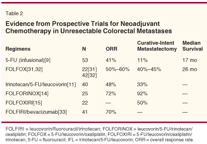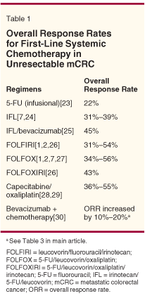 Tumor response rate has nearly tripled over the past decade with contemporary colorectal chemotherapy (see Table 1). In addition, tumor shrinkage has been correlated with successful liver metastectomy in a retrospective analysis of published trials, and can help in selecting the optimal neoadjuvant regimen(s) in mCRC patients with potentially resectable metastases.[3]