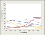 Trends in Death Rates Among Females for Selected Cancers, United States, 1930 to 2008