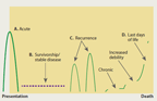 Finally, a change in treatment trajectory, determined by either the clinician or the patient, warrants palliative care involvement. Examples include toxicity from treatment (ie, grade IV graft-versus-host disease in a transplant patient), refractory disease (ie, disease that is no longer treatment-sensitive), or a reluctance on the part of the patient to continue with anti-cancer therapy due to the burdens of treatment. Figure 4 depicts the disease trajectory often seen in cancer. Palliative care integration is appropriate at diagnosis, when disease recurs (this is often the first time when people recognize that they are/or may die of their disease-ie, a decision-making point), and when disease becomes advanced or incurable. Individualized assessment of each patient, with attention to both the molecular basis of the cancer and the issues that cause suffering for patient and family, ensures quality integrated care.