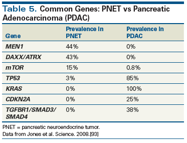 Recent interest in additional targets has led to the identification of mutations in MEN1, DAXX/ATRX, and mTOR genes in well-differentiated PNETs (Table 5). Initial studies suggest a prognostic role for these mutations; however, their clinical utility is still unknown.[72] Currently, targeted therapy is not predicated on the presence or absence of mutations, and routine testing is not recommended.[65] However, targeted therapies show promise and remain an active area of research in PNETs.