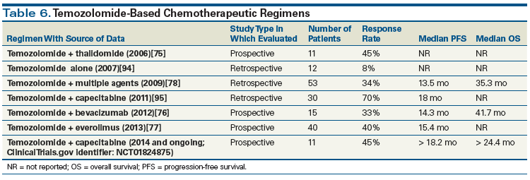 Cytotoxic chemotherapies are reserved for patients who are highly symptomatic from unresectable advanced disease; patients with rapid tumor growth; and those whose disease has progressed on other treatments, such as somatostatin analogs or targeted therapies. Historically, streptozotocin and dacarbazine were the chemotherapeutic agents of choice, with RRs of 30% to 70%; however, both agents are limited by toxicity.[73,74] Currently, the preferred cytotoxic regimens consist of temozolomide in combination with other chemotherapeutic agents (Table 6). Temozolomide-based regimens have ORRs of 24% to 45%.[75-77] PNETs are more likely than other gastrointestinal NETs to respond to temozolomide.[78]