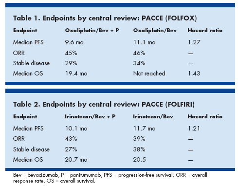 An interim analysis of the randomized open-label PACCE (Panitumumab Advanced Colorectal Cancer Evaluation) study showed that adding panitumumab to first-line chemotherapy-plus-bevacizumab (Avastin) regimens for metastatic disease offered no additional benefits in terms of progression-free or overall survival, while toxicity was increased.