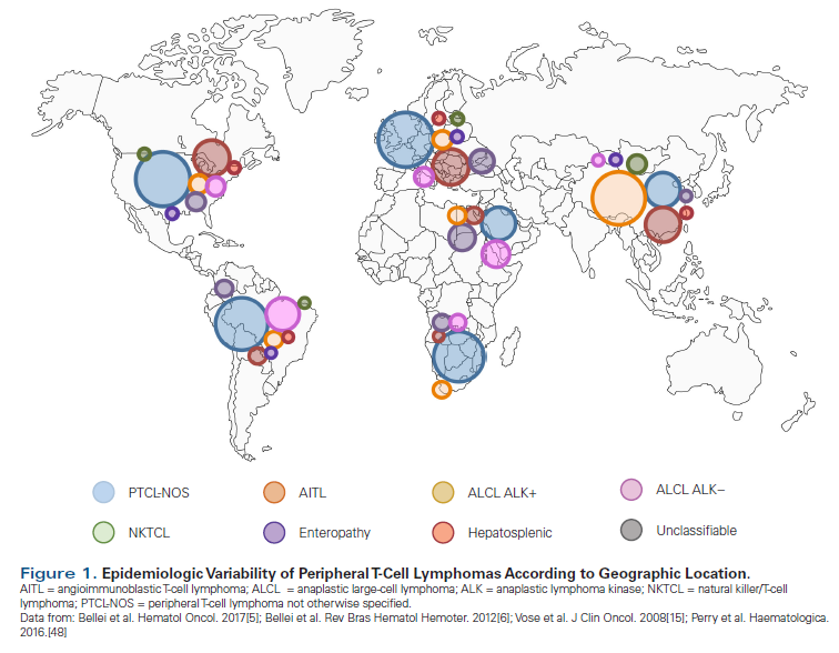 PTCLs have a higher incidence in males, Caucasians, and adults aged 50 to 60 years.[5-9] Over the last decade, there has been an increase in the incidence of PTCLs, which could be partially explained by diagnostic advances and the aging of the population.[10] Several studies have demonstrated the epidemiologic variability found across different geographic populations (Figure 1). The incidence of each subtype is influenced by age, gender, and ethnicity.[3,5,8] Additional risk factors are a family history of hematologic malignancies, immune perturbations (autoimmune etiology or inflammatory response), alcoholism, and smoking.[8,9,11]