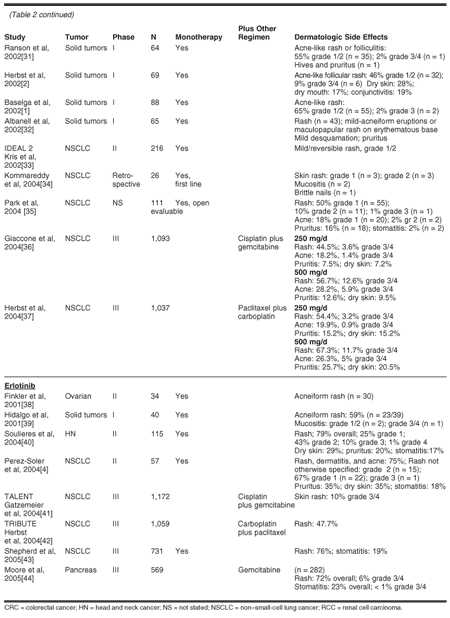Increasing attention is currently being directed toward the chemotherapeutic selective inhibition of the epidermal growth factor receptor (EGFR) in colon, head and neck, pancreatic, and non-small-cell lung cancers. As the use of EGFR inhibitors is becoming more widespread, growing amounts of data are being collected regarding their efficacy and adverse effects.