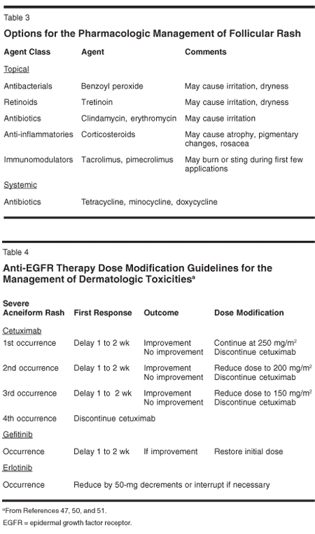 Because the etiology of the EGFR inhibitor-induced follicular eruption is still unknown, management to date has been largely empiric. Most studies report anecdotal evidence with topical and/or systemic antibiotics, topical retinoids, and topical and/or systemic corticosteroids. The remainder of this section will discuss several treatment options (see Table 3). The information contained herein is based on anecdotal reports. We need additional information in the way of controlled trials to optimize tolerance to EGFR inhibitor-induced cutaneous eruptions. Furthermore, a multidisciplinary approach, with collaboration between oncologists and dermatologists and referrals to dermatologists for complicated cases, cannot be overemphasized.