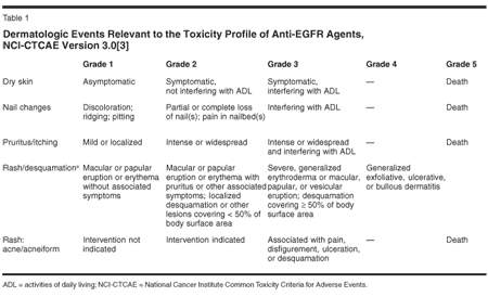 The earliest reports of toxicities from EGFR inhibitors in the oncologic literature noted cutaneous toxicities as one of the most consistent side effects of EGFR blockade.[1,2] Cutaneous reactions to EGFR inhibitors include a characteristic follicular eruption, toxicity of the nails and distal digits, generalized xerosis, desquamation, pruritus without rash, hyperpigmentation, erythema, oral and nasal mucosal aphthae, skin hyperpigmentation, vaginal dryness and pruritus, blepharitis, ingrown eyelashes, trichomegaly, mild ocular irritation, alopecia, fine, brittle, and curlier hair, and a seborrheic dermatitis-like facial eruption (for major categories of dermatologic events, see Table 1).[4-9] Data now suggest that the follicular eruption is the most clinically significant of the cutaneous toxicities, as it is a potential marker of response to therapy. The remainder of this article will further characterize the cutaneous toxicities associated with EGFR inhibition, discuss the criteria for grading cutaneous toxicities, and make treatment recommendations.