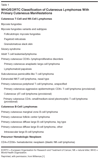 1. Willemze R, Jaffe ES, Burg G, et al: WHO-EORTC classification for cutaneous lymphomas. Blood 105:3768-3785, 2005.