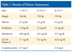 The role of vitamin D in cancer and other illnesses is being heavily researched, with the recommended daily allowance in vitamin D supplements still a subject of controversy. In November 2010 the Institute of Medicine (IOM) issued the report, “Dietary Reference Intakes for Calcium and Vitamin D,” updating its 1997 guidelines. The IOM reports recommends that adults 50 years of age and younger take 600 IU/day and those aged 51 years and older take 800 IU/day, with a suggested limit of 4,000 IU/day. These intake amounts translate to a serum level of 20 ng/mL, but some experts believe that target serum levels of vitamin D should be higher, in the 30–32 ng/mL range. Symptoms of vitamin D deficiency in addition to osteoporosis may include bone pain, muscle weakness, and cognitive impairment. Not surprisingly, Mr. L's vitamin D level was found to be low (see Table 1) due to fat malabsorption, and he was give supplementation with 50,000 IU of vitamin D twice a week for 6 weeks.