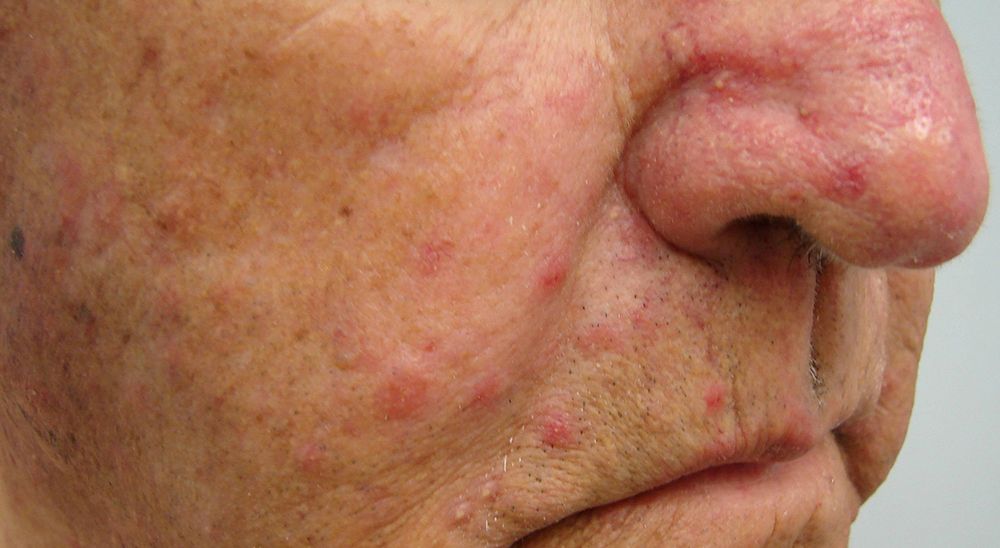 A 59-year-old man experienced a grand mal–type seizure without prior history of a seizure disorder. Neurologic workup revealed multiple brain metastases. Thorough evaluation ensued; ultimately, a primary asymptomatic bronchogenic adenocarcinoma was discovered. In addition to palliative cranial radiotherapy, the patient was treated with cyclic chemotherapy consisting of: docetaxel (Taxotere), carboplatin, and bevacizumab (Avastin). Following the second cycle of chemotherapy, the patient developed a progressive and painful cutaneous eruption involving the face, shoulders, and upper torso. The eruption was acneiform, consisting of folliculocentric papules, pustules, and nodules. The patient was treated with oral doxycycline and topical benzoyl peroxide-clindamycin gel.