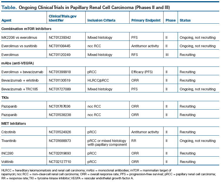 Ongoing clinical trials in papillary renal cell carcinoma include several phase II and III studies (Table) designed to determine the efficacy of a variety of targeted therapies. Agents being investigated include TKI and mTOR inhibitors, as well as drugs with novel mechanisms of action, such as c-Met inhibitors, anti-endoglin agents, and immune checkpoint blockers.