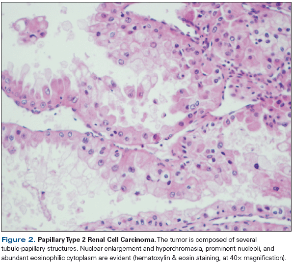 As mentioned previously, tumor biology differs between type 1 and type 2 papillary renal cell carcinoma. In addition, small cohorts or subgroup analyses have shown that outcomes are poorer in patients with type 2 histology than in those with type 1 lesions, with a worse 5-year cancer-specific survival (74% for type 2 vs 94% for type 1; P = .027) and an increased risk of developing distant metastasis after primary resection.[14] The SUPAP phase II study by the French Genitourinary Tumor Group (GETUG) evaluated first-line sunitinib for type 1 (15 patients) and type 2 (46 patients) locally advanced or metastatic papillary renal cell carcinoma. Because there were many fewer type 1 patients than there were type 2 papillary renal cell carcinoma patients, results must be viewed with caution. Nonetheless, the authors reported a trend towards longer PFS and OS in the type 1 papillary renal cell carcinoma group, as compared with type 2 papillary renal cell carcinoma (PFS, 6.6 vs 5.5 months; OS, 17.8 vs 12.4 months).[15] Further research is needed to clarify whether these results are due to different physiopathologic mechanisms of tumorigenesis and natural course of disease, or due to differing responses to treatment.