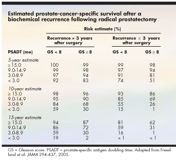 Another study cited by both speakers was D'Amico et al (J Natl Cancer Inst 95:1376-1383, 2003), which examined a cohort of 8,669 patients with PSA recurrence after definitive local therapy. PSA doubling time of 3 months or less was strongly associated with time to prostate-cancer-specific mortality (HR 19.6).