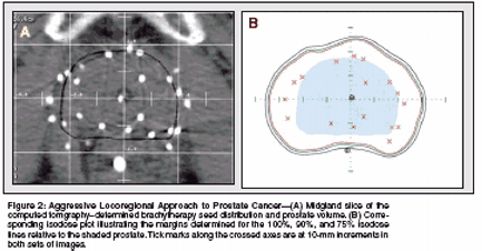 Although some patients with adverse pathologic features have subclinical distant metastatic disease at diagnosis, a high 5-year cause-specific survival has been reported in hormone-naive patients using either dose-escalated high-dose-rate brachytherapy or external-beam radiation therapy.[53,54] These findings are in sharp contrast to the assumption that most patients with adverse pathologic features have subclinical distant metastases at diagnosis. Instead, an aggressive locoregional approach that includes generous periprostatic brachytherapy treatment margins and/or the addition of supplemental external-beam therapy can result in a high likelihood of cancer eradication (Figure 2).[55] Consistent with this finding, an evaluation of Radiation Therapy Oncology Group trials revealed an improved 5-year overall survival for patients with higher Gleason scores who received higher external-beam doses.[54]