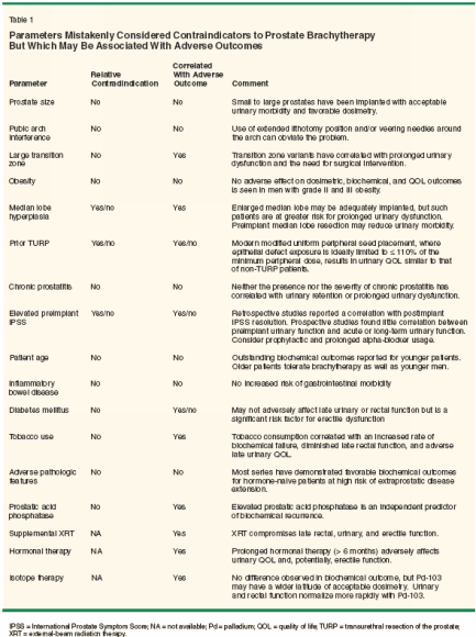 Most brachytherapy studies have demonstrated favorable and durable biochemical outcomes with acceptable morbidity. While there is no shortage of opinions regarding symptoms or circumstances that render the use of brachytherapy inadvisable, most are baseless: Reports to date have failed to establish any firm contraindication. Even in situations where patients present with alleged contraindications, brachytherapy may still be the best choice compared to the alternatives. Continued efforts to refine patient selection, brachytherapy quality, and postimplant management should further decrease brachytherapy- related morbidity.