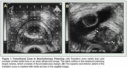 In contrast to overall prostate size, transition zone volume has consistently correlated with brachytherapy-related urinary morbidity (Figure 1).[20-22] Thomas and colleagues reported that transition zone volume was the most important predictor of acute urinary retention following magnetic resonance-guided prostate brachytherapy.[20] In addition, the transition zone index (TZI = transition zone volume/ prostate gland volume) was reported to correlate with time to normalization of International Prostate Symptom Score (IPSS), maximum increase in IPSS, and the need for postimplant surgical intervention.[21] In patients receiving neoadjuvant hormonal therapy for cytoreduction, IPSS normalization, prolonged catheter dependency, and the need for a postbrachytherapy transurethral resection (TURP) were best predicted by the percent decrease in transition zone volume.[22] Indeed, the transition zone and its variants may have greater predictive power for prolonged urinary dysfunction and the need for subsequent intervention than any other single parameter.
