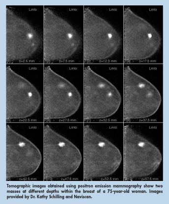 "Everything is moving to molecular imaging," said Dr. Schilling, director of breast imaging and intervention at Boca Raton Community Hospital. "I think this will be breast cancer's molecular imaging tool." Boca Raton Community Hospital, which does some 55,000 breast exams annually, routinely applies PEM as part of a research protocol aimed at determining the clinical value of the fledgling tool. PEM images are interpreted by a staff of six radiologists there.
