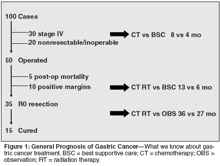 Figure 1 illustrates the generalized overall prognosis of gastric cancer. Out of 100 consecutive, unselected patients who present clinically (and undergo medical and/or surgical intervention), approximately 15 are cured. This figure derives from the generalized clinical observation that 30 patients will present with uncurable stage IV disease; 20 will have unresectable tumors (either due to their locally advanced nature or associated comorbid conditions). Of the 50 who will undergo surgery, 5 will generally die from postoperative complications, and 10 will have positive surgical margins, which lack curative treatment. The standard recommendations of management for each condition are also illustrated in Table 1.