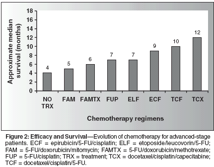 The clinical research and drug development during the past 20 years have produced a series of incremental improvements in the median survival of these patients. In general, one may state that progress has been achieved even in the most prohibitive disease settings. Figure 2 illustrates this concept. From the median survival of 3 to 4 months reported with no treatment, the combinations of fluorouracil (5-FU)/doxorubicin (Adriamycin)/mitomycin (FAM),[3] 5-FU/doxorubicin,[4] 5-FU/doxorubicin/ methotrexate (FAMTX),[5,6] 5-FU/cisplatin (Platinol) (FUP),[6] and 5-FU/etoposide/leucovorin (ELF)[7,8] progressively increased median survival rates. Comparable improvements were obtained with epirubicin/cisplatin/5-FU (ECF) with increases in survival ranging from 8.7 to 8.9 months, with improved safety profile and quality of life.[9,10] Finally, the recent use of the taxane docetaxel (Taxotere) in combination with cisplatin and 5-FU (TCF) produced one of the greatest durations of median survival reported in randomized trials in advanced gastric cancer.[11,12]