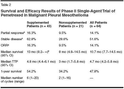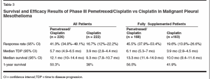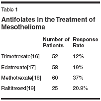 Malignant pleural mesothelioma (MPM) is a disease with a poorprognosis, related in part to the aggressiveness of this disease, and inpart due to the lack of drugs that have demonstrated tumor activity.Historically, antifolates such as methotrexate have been the most activedrugs in the treatment of mesothelioma. Newer antifolates haverecently demonstrated higher efficacy than older regimens in the treatmentof this rare disease. One of these agents, pemetrexed (Alimta),has been evaluated both as a single agent and as part of a combinationregimen. Pemetrexed has been studied in three trials in patients withMPM, and two phase I trials included patients with MPM. In a phaseII trial, pemetrexed was studied as a single agent in patients with MPM.Seven of 64 patients achieved partial responses, with a median overallsurvival of 10.7 months. A large, randomized, phase III trial was conductedto compare pemetrexed/cisplatin with cisplatin. The responserate was 41.3% compared with 16.7%, median survival was 12.1 monthscompared with 9.3 months, and 1-year survival was 50.3% vs 38% inthe pemetrexed/cisplatin and cisplatin arms, respectively. The combinationof pemetrexed/cisplatin also demonstrated superiority in qualityof life and pulmonary functioning analysis when compared withcisplatin.