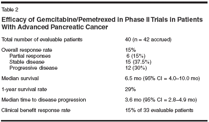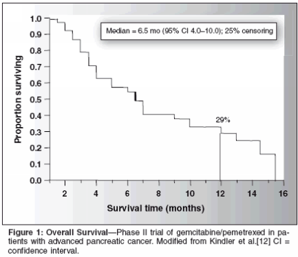 Kindler HL, Dugan W, Hochster H, etal: Clinical outcome in patients (pts) with advancedpancreatic cancer treated withpemetrexed/gemcitabine (abstract 499). ProcAm Soc Clin Oncol 21:5, 2002.