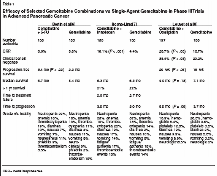 Single-agent gemcitabine (Gemzar) is the standard of chemotherapyfor advanced pancreatic cancer, with no phase III trials to date havingshown significantly improved survival with gemcitabine-based combinationsvs single-agent treatment. The multitargeted antifolate agentpemetrexed (Alimta) shows synergistic effects in vitro in combinationwith gemcitabine, and activity and good tolerability when used as singleagenttreatment in advanced pancreatic cancer. In a phase II trial inpatients with advanced pancreatic cancer, the combination ofgemcitabine at 1,250 mg/m2 on days 1 and 8 plus pemetrexed at 500mg/m2 on day 8 after gemcitabine every 21 days resulted in a mediansurvival of 6.5 months and a 1-year survival rate of 29%. Neutropeniawas the primary toxicity, with grade 4 toxicity in 51% of patients. Thepromising results of this trial prompted the initiation of a phase IIItrial comparing gemcitabine at 1,000 mg/m2 on days 1, 8, and 15 every28 days vs the 21-day gemcitabine/pemetrexed regimen given with vitaminsupplementation in patients with pancreatic cancer. The primaryoutcome measure was overall survival, with secondary measures includingresponse rate, progression-free survival, and quality of life.While an increase in response and time to progression was reported forthe gemcitabine/pemetrexed combination, there were no significantdifferences in survival between treatment arms.
