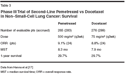 According to the updated 2004 guidelines of the American Societyof Clinical Oncology (ASCO) on the treatment of advanced non–smallcelllung cancer (NSCLC), docetaxel (Taxotere) can be considered thestandard second-line chemotherapy in patients relapsing after frontlinetherapy. This was based on two phase III trials (TAX 317 and TAX320) that demonstrated the superiority of docetaxel at 75 mg/m2 in theparameters of survival, quality of life, and disease/symptom controlwhen compared to best supportive care or alternative single-agent chemotherapy.The response rate was approximately 6%, with a mediansurvival time of 7 months and a 1-year survival rate of 30%. Despitethe activity demonstrated, this schedule showed an important toxicityprofile, with grade 3/4 neutropenia and febrile neutropenia occurringin 70% and 11% of patients, respectively. However, the results obtainedby these studies stimulated research interest in new drugs for this diseasesetting. Pemetrexed (Alimta), a new multitargeted antifolate, hasachieved promising results in NSCLC treatment, as a single agent or incombination with other drugs. In the second-line setting, a large phaseII study demonstrated good activity of pemetrexed, with an acceptabletoxicity profile. This led to a phase III registration trial that comparedpemetrexed at 500 mg/m2 to the standard docetaxel dose of 75 mg/m2.While results from this trial demonstrated a similar efficacy of the tworegimens in response rate and survival, pemetrexed achieved a bettersafety profile. These results support the use of pemetrexed as a newoption in the second-line treatment of NSCLC.