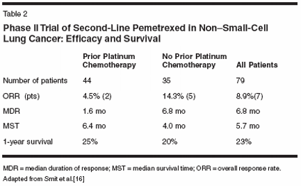 Shepherd FA, Dancey J, Arnold A, et al:Phase II study of pemetrexed disodium, amultitargeted antifolate, and cisplatin as firstlinetherapy in patients with advanced nonsmallcell lung carcinoma: A study of the NationalCancer Institute of Canada Clinical TrialsGroup. Cancer 92:595-600, 2001.