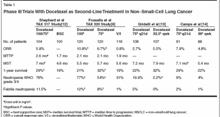 Camps C, Massuti B, Jimenez AM, etal: Two second-line docetaxel dose-schedulesin advanced non-small cell lung cancer(NSCLC): A Spanish Lung Cancer Group(SLCG) phase III trial. Lung Cancer 41(suppl2):S5, 2003 (abstract O-2).