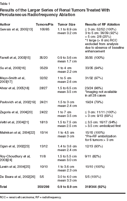 Over 35,000 new cases of renal cell carcinoma (RCC) occurred in the United States in 2004,[1] most of them detected as incidental imaging findings on computed tomography (CT), magnetic resonance (MR), or ultrasound.[2,3] Since most of these tumors are relatively small when detected, the classic clinical triad of flank pain, hematuria, and palpable mass is now rarely encountered. Many of these incidentally discovered RCCs are also slowly growing. Bosniak et al showed that RCCs smaller than or equal to 3.5 cm grow at an average rate of 0 to 1.1 cm/yr (mean 0.36 cm/yr).[4] Most RCCs are surgically removed, and resection of RCC remains the standard of care.[5] Traditional treatment has been open complete nephrectomy, but the search for less invasive procedures as well as for nephronsparing surgery has led to alternative surgical approaches.[6,7] These include partial open and laparoscopic partial or complete nephrectomy. For appropriately selected tumors, nephron- sparing resection has shown outcomes that are equivalent to total nephrectomy.[5-7] Open, partial, and laparoscopic nephrectomies are now available to most patients. For some patients, however, an even less invasive procedure may be indicated. Patients with solitary kidneys or limited renal function, for example, may not tolerate even a partial nephrectomy without requiring postoperative dialysis. For patients with bilateral or multiple RCCs, further partial nephrectomy may tip them to dialysis. Finally, patients with extensive comorbid conditions may face unacceptable risks from surgery and general anesthesia. Imaging surveillance has been advocated for elderly patients with comorbid conditions placing them at high risk for operative complications or complications related to anesthesia, because of the slow growth of these small tumors and the strong likelihood that many of them will never become clinically significant. This course of action may result in unacceptable patient anxiety, however. Percutaneous ablation may provide an alternative treatment option for all these groups of patients. Ablation of RCC left in situ has been performed intraoperatively using cryoablation before percutaneous cryoprobes became available.[8] Cryoablation induces tumor necrosis by freezing tissue. The first needle applicators suitable for percutaneous application were radiofrequency electrodes. Thus, most of the published literature on percutaneous ablation of renal masses is on RF ablation, which induces tumor necrosis via lethal hyperthermia. Now that percutaneous cryoprobes are available, experience with imageguided percutaneous cryoablation will undoubtedly increase. A microwave ablation system with percutaneous applicators, also based on hyperthermia, has become available in the United States, but no published reports of its use in renal tumors left in situ have yet appeared. In 1997, Zlotta et al reported the first percutaneous application of renal RFA, confirming its safety and feasibility under local analgesia.[9] In his initial series, three tumors were subsequently resected, confirming RFA's ability to create extensive local necrosis in in vivo renal tumors.[9] In 1999, McGovern et al reported the first in situ renal tumor treated solely with RFA.[10] In 2000, Gervais et al presented the first series of such patients treated solely with RFA.[11] Nine tumors in eight patients underwent RFA with postablation imaging surveillance to monitor treatment response. Because the tumors were left in situ, assessment of tumor response was performed with imaging. Gervais et al applied a CT or MR interpretive scheme based on extrapolation of radiologic- pathologic correlation work in liver tumor ablations performed by Goldberg et al.[11,12] In this study, necrosis was shown to correlate with lack of enhancement to within 2 mm and tumor enhancement was shown to correlate with viable tumor.[12] This interpretative scheme has since been widely applied by other investigators. Since these early reports, multiple series of renal tumors treated with percutaneous ablation in vivo and left in situ have been published.[13-26] Table 1 summarizes the results of the larger published series of percutaneous RFA of renal tumors. These series reveal that for small renal tumors, RFA results in complete necrosis at imaging in 79% to 100% of cases.[13- 26] Differences in results are related partly to differences in protocol. In one protocol in which early residual disease was treated with repeat percutaneous ablation, for example, 100% complete necrosis at imaging was achieved for all tumors 4 cm or smaller.[ 13] The series with the lowest success rate (79%) used less powerful generators than are now commonly available, perhaps resulting in less complete ablation.[19] Modern systems average over 90% complete necrosis in small tumors. The follow-up period following renal tumor ablation has been short, however, averaging less than 3 years. Although early experience is encouraging, long-term outcomes are necessary to provide meaningful comparison to standard surgical resection.
