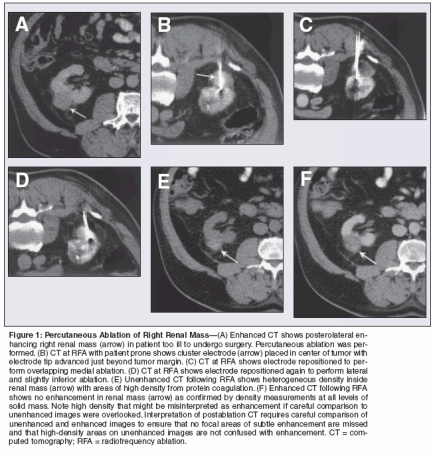 Issues to consider in preparing a patient for ablation include tissue diagnosis, status of outpatient vs shortstay inpatient care, and choice of sedation vs anesthesia. Percutaneous ablation of RCC can be performed as an outpatient procedure,[13] but admission may be required to allow complete recovery from sedation. Intravenous sedation is used in many cases (midazolam 2 to 5 mg, fentanyl 100 to 300 μg, meperidine 50 to 100 mg).[13] Selected patients may require general anesthesia if they do not meet institutional criteria for IV sedation. Some institutions prefer to perform all cases under general anesthesia.[18] Differential diagnosis of a solid enhancing mass on CT or MRI includes RCC, fat poor angiomyolipoma, oncocytoma, metastases, or lymphoma. Definitive pathologic diagnosis of a renal mass left in situ requires needle biopsy. Traditionally, for management purposes, urologists have treated a solid enhancing renal mass at CT or MR as renal cell carcinoma. Since needle biopsies may miss RCC in a small number of cases, all these masses were resected, providing material for histology. Leaving the renal tumor in situ after ablation, however, provides no tissue diagnosis to help guide postablation management. A recent report found that 10 of 27 patients referred for ablation had benign masses.[31] Thus, most patients undergo needle biopsy to establish a diagnosis prior to ablation. In selected cohorts, such as patients with von Hippel-Lindau, some have argued against biopsy prior to ablation because the likelihood of RCC is high regardless of biopsy results.[19] This area remains controversial. Following ablation, imaging follow- up with unenhanced and enhanced CT or MR allows for response assessment (Figures 1E and 1F).[11] Although imaging intervals vary among institutions, most radiologists perform imaging within one month for prompt detection of residual viable tumor.[13-27] Small foci of residual viable tumor can then be ablated again.[14] Because of the lack of longterm data on the efficacy of ablation, imaging continues indefinitely, initially at 3- to 6-month intervals and then at annual intervals once no viable tumor has been confirmed in the first year or two of follow-up. Recovery from percutaneous ablation involves the effects of sedation or anesthesia on the first day. In the first few days, patients normally experience mild to moderate local discomfort that improves over time. Postablation syndrome, flulike symptoms such as fever, muscle ache, and fatigue, is seen in a minority of patients. The syndrome is self-limiting and responds well to acetaminophen or nonsteroidal anti-inflammatory agents. Complications are rare following RFA compared with partial nephrectomy.[ 5-7,13] The most common is hemorrhage, and this may be more common in central tumors.[13] Urinary collecting system obstruction can occur from ureteral injury with stricture formation or from bleeding into the collecting system.[13,14] Injury to nerves from the lumbar plexus may cause transient paresthesias along cutaneous nerve distributions.[13,15,19] Tract seeding has been reported in a single case in which a cutaneous tumor was subsequently removed.[17] There is also potential for bowel injury or pleural complication requiring thoracostomy drainage. Conclusion Percutaneous ablation of renal tumors has shown promising early results. Until long-term data are available, the use of percutaneous ablation for solid renal masses is limited to patients who are not ideal candidates for surgical resection. Tumor factors play an important role in case selection, with tumors 4 cm or smaller yielding up to 100% complete necrosis with modern ablation systems. Exophytic location provides a favorable "oven effect" from the insulating properties of the perirenal fat, while central location may make complete ablation more difficult due to the perfusion in large hilar blood vessels. Because current results come from tumors left in situ with short postablation follow-up, longterm results are necessary to compare outcomes to surgical standards. Complication rates are lower than those following partial nephrectomy. Future reports will shed light on the long-term outcomes of percutaneous ablation and the relative advantages and disadvantages of various technologies for thermal ablation.
