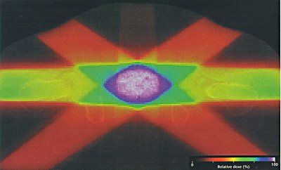 The image shows the radiation therapy treatment plan for a seven-field conformal boost to the prostate, using Peregrine, a 3D Monte-Carlo-based dose calculation system. Monte Carlo simulates the trillions of radiation particles that enter the body during treatment and develops a detailed computerized map of the radiation dose the patient will receive. The technology, developed at the Lawrence Livermore National Laboratory and licensed to NOMOS Corporation, has received FDA clearance for marketing. Image courtesy of NOMOS and the Lawrence Livermore National Laboratory, Livermore, California.